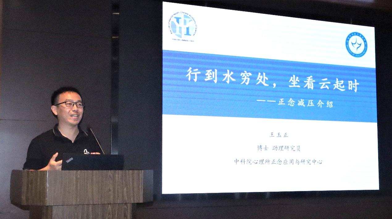 王玉正作《行到水穷处,坐看云起时——正念减压介绍》的讲座,以我国心理健康服务需求重大为切入点,结合案例分析介绍了压力与烦恼产生的过程。讲座过程中,他引导听众体验闭眼感受大脑的思考、从葡萄干的观察重新认识世界、现场正念训练等,让大家认识了解正念的概念、核心以及如何使用正念训练使内心恢复平静,接纳自己,减少内耗,有耐性地与一切和平共处,从而达到减压的目的。