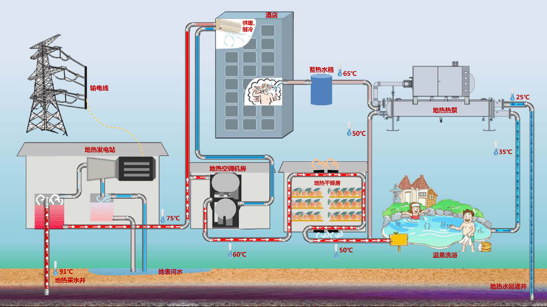 图片名称:120kW热泵蒸汽机组样机测试平台 4. 地热资源综合利用集成技术 结合华南地区地热资源特点,重点开展地热资源综合利用关键技术、装置及示范的研究,提出了一套高效的地热资源综合梯级利用技术集成系统。通过以“地热制冷-地热干燥-地热洗浴-地热热泵”为核心的四级梯级利用,实现地热资源综合利用率达到70%以上。