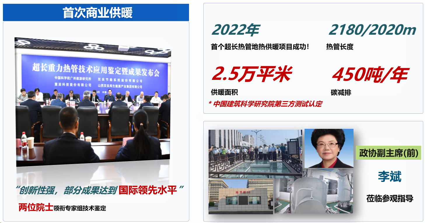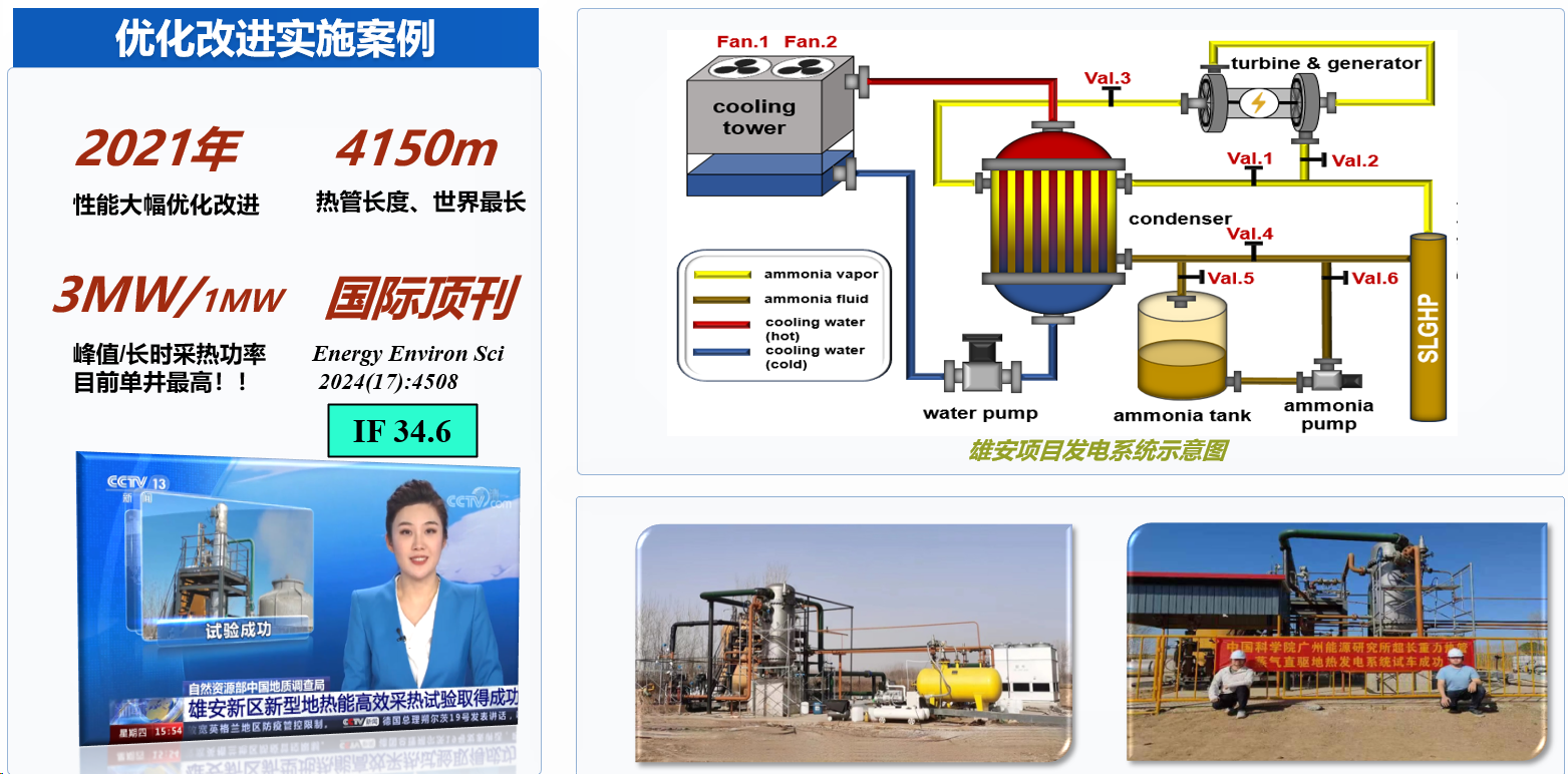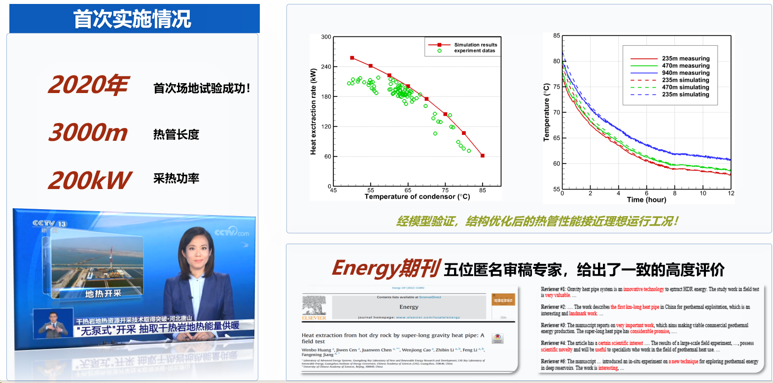 1. 科研团队研发了超长重力热管,在河北唐山马头营一口地热深井内完成安装并开展了长达4个月的采热试验,尝试开展了地热温差发电试验。试验结果显示,在地下取热段岩石平均温度为119oC的地热条件下,地面获得了温度最高达90oC的饱和水蒸汽,持续采热功率接近200千瓦。在世界范围首次实现中深层地热资源“只取热、不取水”的“无泵式”开采,取得了中深层地热开发技术重大突破,为地热资源利用开辟了新模式、新路径。 2. 科研团队在太原小店区建造了面向建筑供暖应用的超长重力热管地热开发系统。该系统由相邻的两根长度(分别长2020 m和2180 m)相近的超长重力热管与单个热泵相结合;两口地热井相距30 m,2000 m深度的测井温度均在63oC左右。布置在超长重力热管外壁的光纤测得的热管外壁温度具有显著的均匀性,表明重力热管运行良好。 3. 科研团队研制了一根以氨作为工质的4150 m长度的重力热管并安装在河北雄安一口地热深井内。取热实验证明了该SLGHP地热系统的连续热产出可以超过1 MW,热管径向截面的热通量达4×107 W/㎡。此外,研究团队还提出了热管蒸汽直驱发电的地热发电技术方案,首创热管产出氨蒸汽直接驱动的地热发电机组,并与热管地热开采系统集成。基于该原理研制的样机在72小时发电测试中能够以大约7 kW功率稳定发电,确证了该地热发电技术路线的可行性。 4.科研团队研发完成100kW/500kWh液冷式储能样机,实现了在线识别安全状态,并进行热、安全分级管控。 |