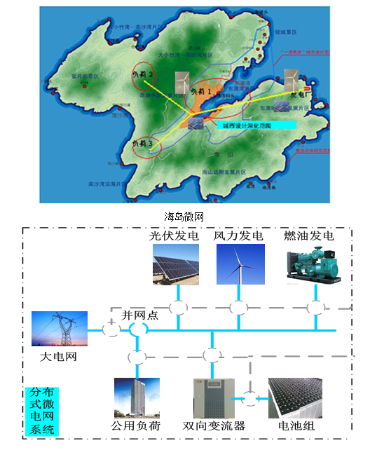 提供完善的微电网系统设计方案、优化方案、评估方案,可根据项目提供标准化系统集成方案;具有多个微电网平台示范基地,以及海岛MW级多能互补分布式微网建设经验。 1. 海岛微电网 海岛微电网系统的传统能源供给多为柴油发电,不仅运行成本高,而且污染了海岛及周边海域,使海岛生态遭到严重破坏,严重制约经济发展。因地制宜,开发海岛新能源,大力推行海岛太阳能、风能等新能源建设,是解决海岛能源问题的重要举措。