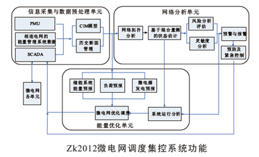 ◆ 微电网能量管理系统 微电网智能调度集控系统是微电网的核心,它对微电网整个系统的运行状态进行监控,并根据实际情况依照多目标协调控制策略对微电网构成元件进行控制和管理。微电网不仅包括各发电单元和储能单元,还包括馈线及负荷,将配网自动化与调度控制系统进行一体化设计,采用分布式的体系结构、面向对象的组件技术等先进的计算机控制技术,从而使系统具有高度开放性和可扩充性。分布式发电微电网的各组件的运行状态采用以太网、GPRS无线通讯等网络进行实时监测,通过对关键参量的实时监控,对微电网的运行状态进行分析,并在此基础上进行故障诊断,预警,以及采取相应的紧急处理措施。 ZK2012微电网智能调度集控系统是由中国科学院广州能源研究所可再生能源与微网技术实验室,在总结国内外先进的控制和数据采集系统基础上进行设计开发的,利用网络技术保证了系统的实时性,所有模块均用面向对象的程序设计方法,系统易于维护,扩展方便。系统完全摆脱了对具体硬件平台的依赖, 支持WINDOWSNT/2000/XP/2003 等多种操作平台,配置方便灵活。