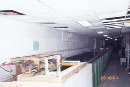 造波机为底惯量电机驱动推板式不规则波造波机。推板宽1.16米,高1.2米,推板最大行程40厘米。造波水槽宽1.2米,高1.2米,长42米,最大造波水深1米。造波机的驱动程序及模拟波谱的控制程序是在Windows下用Delphi4.0写成的。 功能指标:模拟规则波及各种不规则波,模拟波的重复性好、稳定性高。规则波周期范围为0.4-5.0秒,波高范围为2-30厘米。不规则波可模拟P-M谱、会战谱、布氏谱和JONSWAP谱等四种波谱。 应用范围:波浪模拟实验,海工模型实验,波能装置实验等。