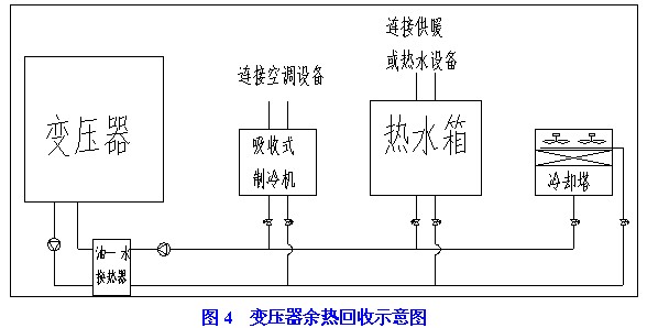 变压器运行时,由于存在铁损和铜损使得变压器内部发热,若得不到有效冷却,在极限温度下长时间运行,绕组绝缘严重老化,并加速绝缘油的劣化,影响使用寿命,也影响变压器的负载率,特别是夏天时尤为明显。回收变压器余热,夏天可以供冷,冬天可以供暖,长年可以供应热水。