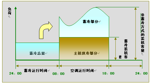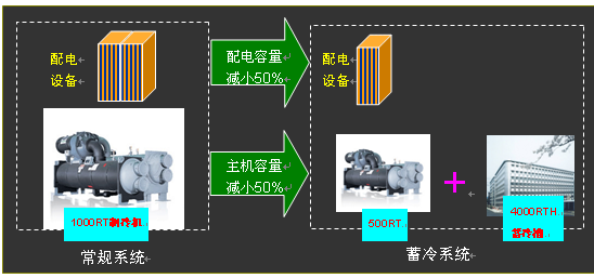 由于夜间蓄冷承担了白天的部分负荷,制冷主机的初装机容量可减小到原来的1/3至1/2,不仅大幅度减小了制冷主机的初装机容量和初投资、而且有效降低了配电系统的容量和初投资。