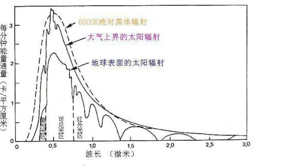 太阳辐射的能量主要集中在波长0.15-4微米之间。在这段波长范围内,又可分为三个主要区域,即波长较短的紫外光区、波长较长的红外光区和介于二者之间的可见光区。太阳辐射的能量主要分布在可见光区和红外区,前者占太阳辐射总量的50%,后者占43%。紫外区只占能量的7%。在波长0.475微米的地方,太阳辐射的能力达到最高值。由于地球以椭圆形轨道绕太阳运行,因此太阳与地球之间的距离不是一个常数,然而,由于日地间距离太大(平均距离为1.5 x 108km),所以地球大气层外的太阳辐射强度几乎是一个常数。因此人们就采用所谓 “太阳常数”来描述地球大气层上方的太阳辐射强度。它是指平均日地距离时,在地球大气层上界垂直于太阳辐射的单位表面积上所接受的太阳辐射能。经过测定,国际学术界一致将“太阳常数”取为1357W/m2。