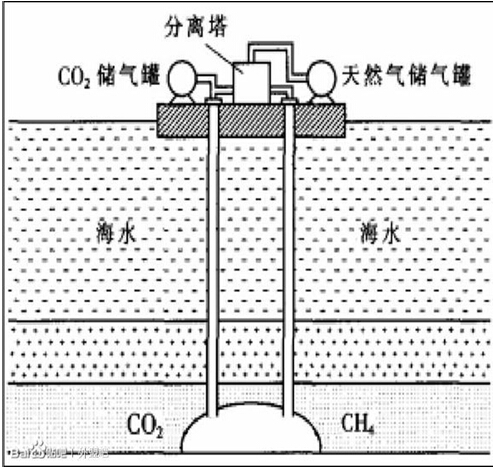 现阶段对于从天然气水合物中提取天然气的方法目前主要分有四类,分别为:热激发法、化学试剂法、降压法和二氧化碳替换法。模型展示的为天然气水合物开采模型中的二氧化碳替换法。利用二氧化碳在水合物相中置换开采CH4,由于置换过程发生在水合物相中,不改变水合物相结构,因此可以降低地质灾害风险。主要是通过二氧化碳气体注入到含甲烷的气-液-水合物三相体系中,并达到二氧化碳、甲烷及水合物的三相平衡,由于二氧化碳水合物具有更高的生成焓和相平衡温度,二氧化碳在水合物中更加稳定,因此在三相平衡后,形成了CH4-CO2混合水合物,并且水合物中二氧化碳浓度大于甲烷浓度,而气相中则相反。实验证明二氧化碳同理可置换出乙烷天然气水合物。置换出的气体通过分离塔提出分离并进行有效收集,即可达到开采天然气的目的。当然,置换开采的方法在现实开采中亟待深入探索,这种方法的制约因素有两个方面,一是置换天然气水合物过程中的反应速率很慢,且随着反应的进行,反应速率迅速降低;二一定压力条件下甲烷水合物的分解温度较二氧化碳水合物形成温度高,一旦二氧化碳不能及时转化为水合物,而是以气体或液体形式存在,将对海底结构稳定性造成影响。