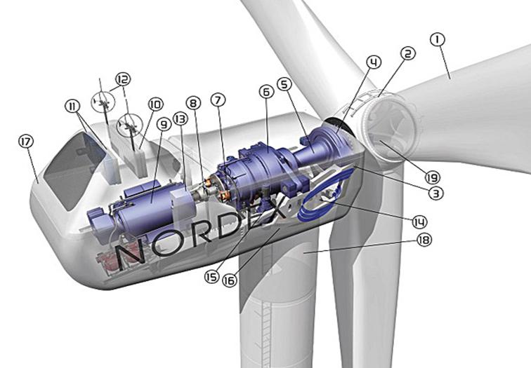 |   图(2)垂直轴阻力型风力机风轮 |  二、风力发电机组结构 风力发电机组系统通常包括风力机、发电机、变速器(小、微容量及特殊类型的也有不包括变速器的)、塔架及有关控制器和储能装置。 风力机:将风能转换为机械能,其上安装有调向机构用来调整风力机的风轮叶片旋转平面与空气流动方向相对位置的机构。因为当风轮叶片旋转平面与气流方向垂直时,也即是迎着风向时,风力机从流动的空气中获取的能量最大,因而风力机的输出功率最大,所以调向机构又称为迎风机构(国外通称偏航系统)。小型水平轴风力机常用的调向机构有尾舵和尾车,风电场中并网运行的中大型风力机则采用的是伺服电动机。  发电机:将机械能转换为电能,微型及容量在10kW以下的小型风力发电机组,一般采用永磁式或自励式交流发电机,经整流后向负载供电及向蓄电池充电;容量在l00kw以上的并网运行的风力发电机组,则一般采用同步发电机或异步发电机。 变速器:一般采用升速齿轮箱,将风力机轴上的低速旋转输入转变为高速旋转输出,以便与发电机运转所需要的转速相匹配。    塔架:水平轴风力发电机组需要通过塔架将其置于空中,以捕捉更多的风能。一般分为由钢板制成的锥形筒状塔架和由角钢制成的桁架式塔架。    控制系统:100kw以上的中型风力发电机组及1Mw以上的大型风力发电机组皆配有由微机或可编程控制器(PLC)组成的控制系统来实现控制、自检和显示功能。    储能装置:目前风力发电的运行方式主要分为独立运行和并网运行两种。对于独立运行的风力发电机需要配备有储能系统,目前主要的储能系统包括蓄电池储能和抽水蓄能,正在研究试验的有压缩空气储能、飞轮储能、电解水制氢储能等技术。        1-叶片 2-轮毂 3-机舱 4-叶轮轴与主轴连接 5-主轴6-齿轮箱 7-刹车系统  8-联轴器  9-发电机 10-散热器11-冷却风扇 12-风速仪和风向标 13-控制系统 14-液压系统 15-偏航驱动16-偏航轴承  17-机舱盖  18-塔架 19-变桨距   图(3)有齿轮箱的水平轴风力发电机组成