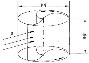 | 图(1)水平轴升力型风力机风轮 |      阻力型风力机的工作原理:如图(2)所示为垂直轴阻力型风力机的风轮,它主要由3个曲面叶片组成。当风吹向风轮,叶片产生阻力,驱动风轮作逆时针方向旋转(俯视)。凹下的叶片驱动风轮旋转,凸起的叶片阻碍风轮的转动每个叶片产生的阻力值可按下式计算:     式中: ——空气密度;    ——风速;    ——叶片线速度.在半径方向线速度的平均数;    ——叶片的最大投影面积(宽度×高度);    ——叶片阻力系数,对于由2个曲面叶片组成的风轮,凹下的叶片的  值可取为1.0,凸起的叶片的  值为0.12~0.25。 在计算  时,式中的“±”号的选取:对风凹下的叶片取“-”;对风凸起的叶片取“+”。对阻力型风力机,凹下的叶片产生的阻力大于凸起叶片产生的阻力,风轮按逆时针方向旋转,若把吹向风轮左面的风挡住,使凸起的叶片不被风吹,更有助于风轮的转动