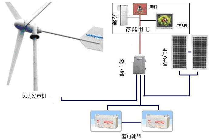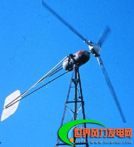| 图(4)风力发电系统的示意图 |  三、风力发电机的分类   根据收集风能的结构形式及在空间的布置,风力机可分为水平轴式和垂直轴式。按风力机的容量可分为微型(1kW以下)、小型(1—10kW)、中型(10—100kW)和大型(100kW以上)机。   水平轴式风力机是目前最具实际开发价值的风力机,功率从几千瓦到数兆瓦,可分为升力型和阻力型两类。升力型旋转速度快,阻力型旋转速度慢,对于风力发电多采用升力型的水平轴风力机。同时,根据螺旋桨的桨叶数量水平轴风力机包括有单叶片式、双叶片式、三叶片式、四叶片式和多叶片式。   垂直轴式风力机根据桨叶的形式不同可分为H型、S型、Φ型等。根据桨叶的工作原理,垂直轴式风力机也可分为升力型和阻力型两类。虽然目前垂直轴风力机尚未大量商品化,但是它有许多优点,如不需大型塔架、结构简单、不需要偏航、发电机可安装在地面上、维修方便、叶片制造简便、成本相对较低等,在中、小型风力机中使用较普遍,适用于海上风电场。