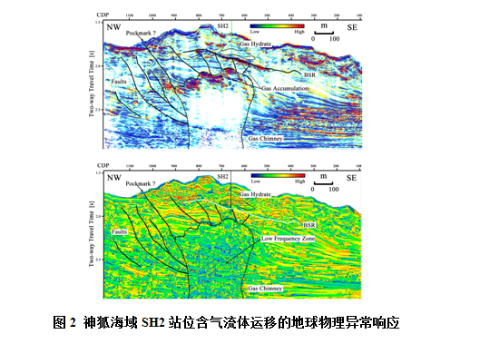 研究人员在研究区内共识别出垂向和侧向两种运移通道类型(图1),指出水合物钻探区内以气烟囱和伴生断层(微裂隙)作为主要的运移通道,通过地球物理处理技术(振幅、AVO、瞬时频率等)揭示了含气流体运移的地球物理异常响应(图2),将地质识别-地球物理异常解释进行有机的结合,证实钻探站位处存在明显的含气流体运移特征和地质记录,似海底反射(BSRs)之下可能存在大量游离气的聚集。同时,研究人员通过钻探区和邻区LW3-1井区的运移通道类型对比和定性分析,提出钻探区内“气烟囱+伴生断层”的通道运移效能要低于LW3-1井区“大尺度断层+底辟构造”的通道类型。神狐海域含气流体运移特征方面的研究成果和进展,将有助于深刻揭示研究区内水合物的赋存规律和成藏机制,并为南海北部水合物的进一步勘探提供参考。