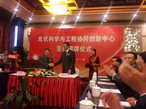 11月18日,由常州大学牵头的光伏科学与工程协同创新中心签约揭牌仪式在常州举行。来自中科院广州能源研究所、中科院宁波材料研究所、东南大学、中山大学、华南理工大学、福州大学、国家太阳能光伏产品质量检测中心(无锡)、常州大学科技园投资有限公司、常州亚玛顿股份有限公司、常州天合光能有限公司等十家合作单位的代表出席仪式。