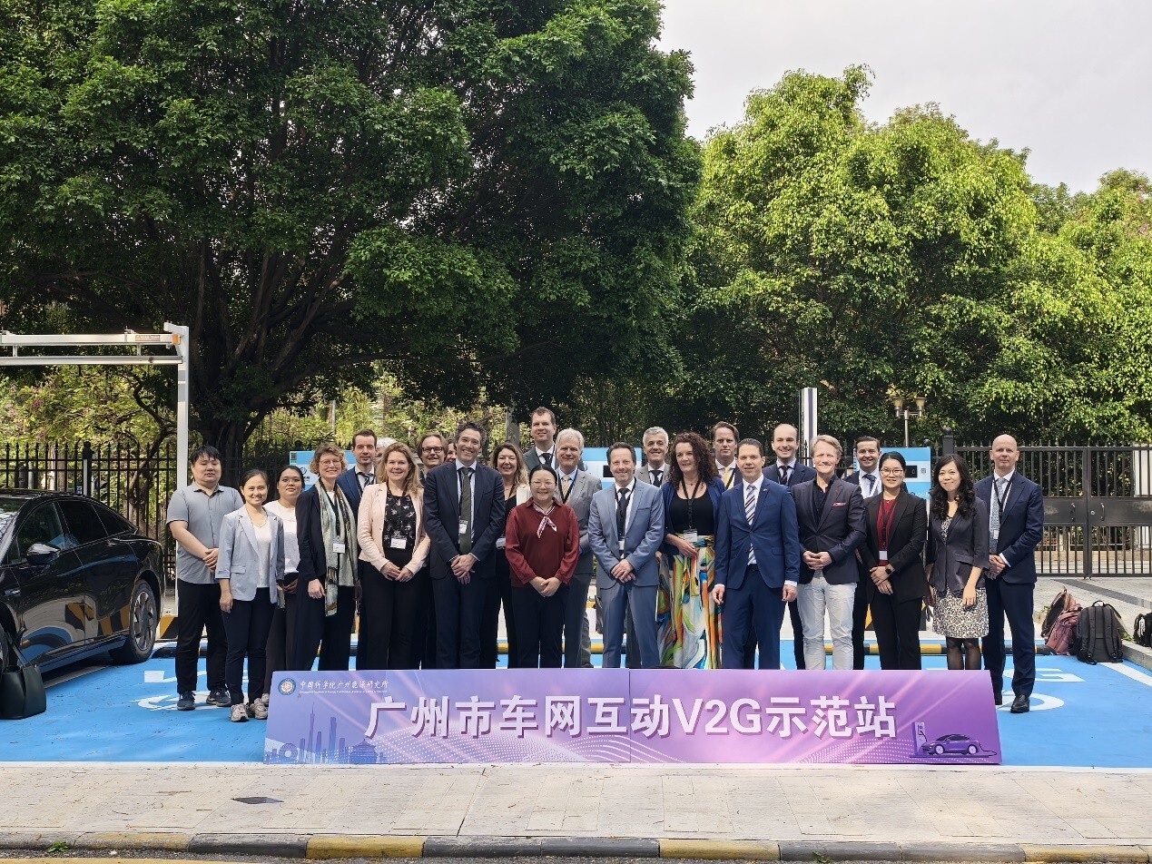 代表团参观了广州能源所V2G(车网互动)充放电示范场站,实地了解新能源汽车与电网互动技术的应用实践。代表团由荷兰驻广州总领事馆、荷兰外商投资局、荷兰驻华大使馆及多家荷兰能源企业、研究机构的代表共22人组成。